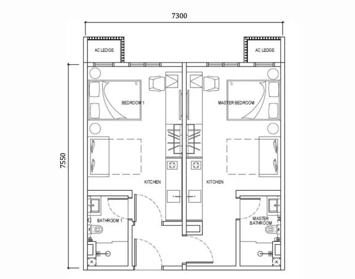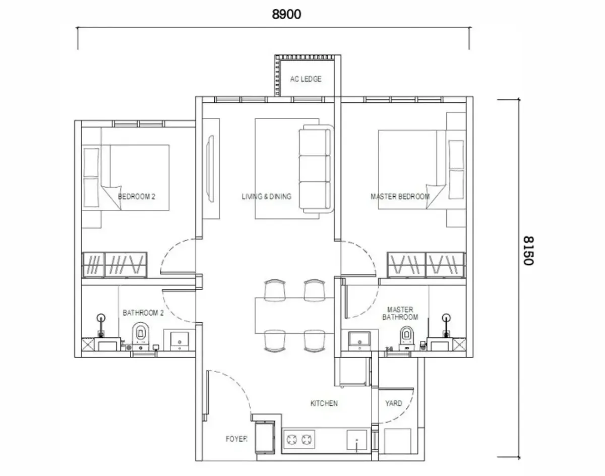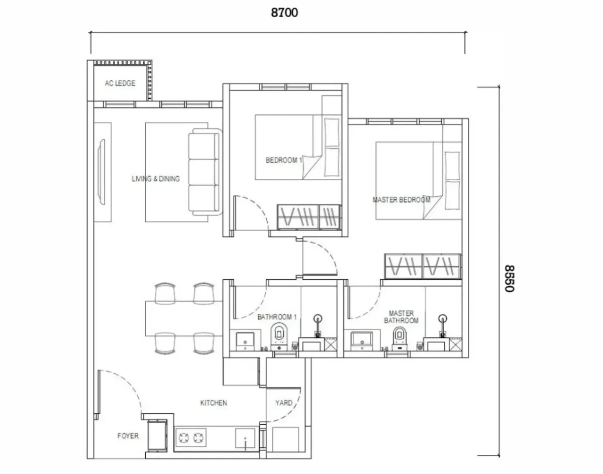 Type D1 - 2 Rooms :667 sq.ft.